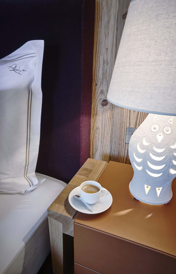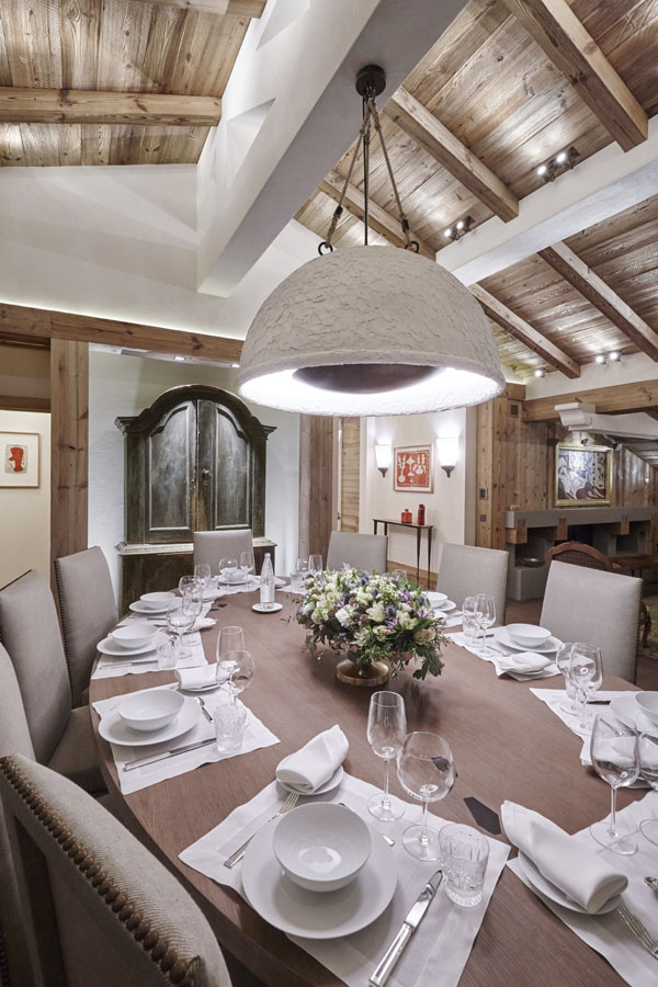 A La Volière, de prime abord, il faut un certain temps pour se rendre compte que la matière brute est presque identique. C’est la même terre que le sculpteur va façonner, mais pour donner à chaque fois un bronze différent. Ainsi, dans le chalet des Bastidons, ont été assemblées des pièces de mobilier ancien, comme des fauteuils Louis XV dans le salon, tandis que d’autres ont été réinterprétées, par exemple les chaises Louis XIII de la salle à manger. Un dialogue des cultures cher à l’architecte, qui prend un tout autre relief dans le chalet Cryst’Aile, avec du mobilier aux lignes plus contemporaines et des luminaires de créateurs. Dans Nanuq, le choix de décoration, toujours un assemblage très Tollemerien, crée encore une atmosphère très différente. En jouant sur les vues extérieures, les scénarios de lumière propres à chaque pièce, l’architecte crée un monde à part. Multiplicité des formes d’expression, mais unicité du style.